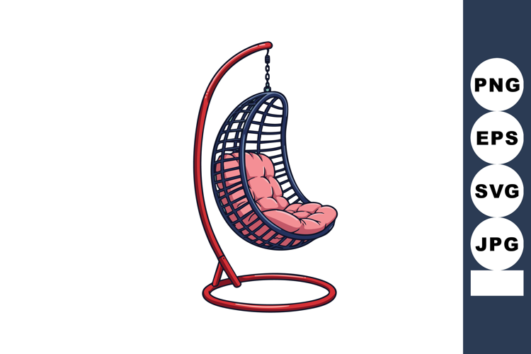 Vector illustration shows a hanging egg chair with a red metal stand and soft pink cushion, ideal for indoor relaxation and comfort. Calm.