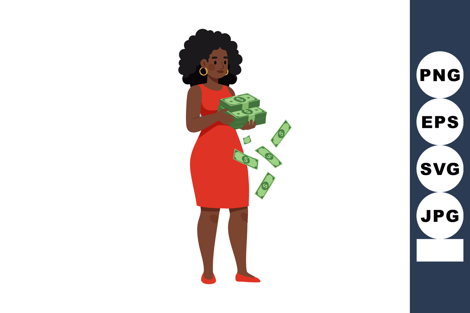 Woman in a red dress holds and releases cash bills, representing money and finance themes in a flat vector style. Calm mood.