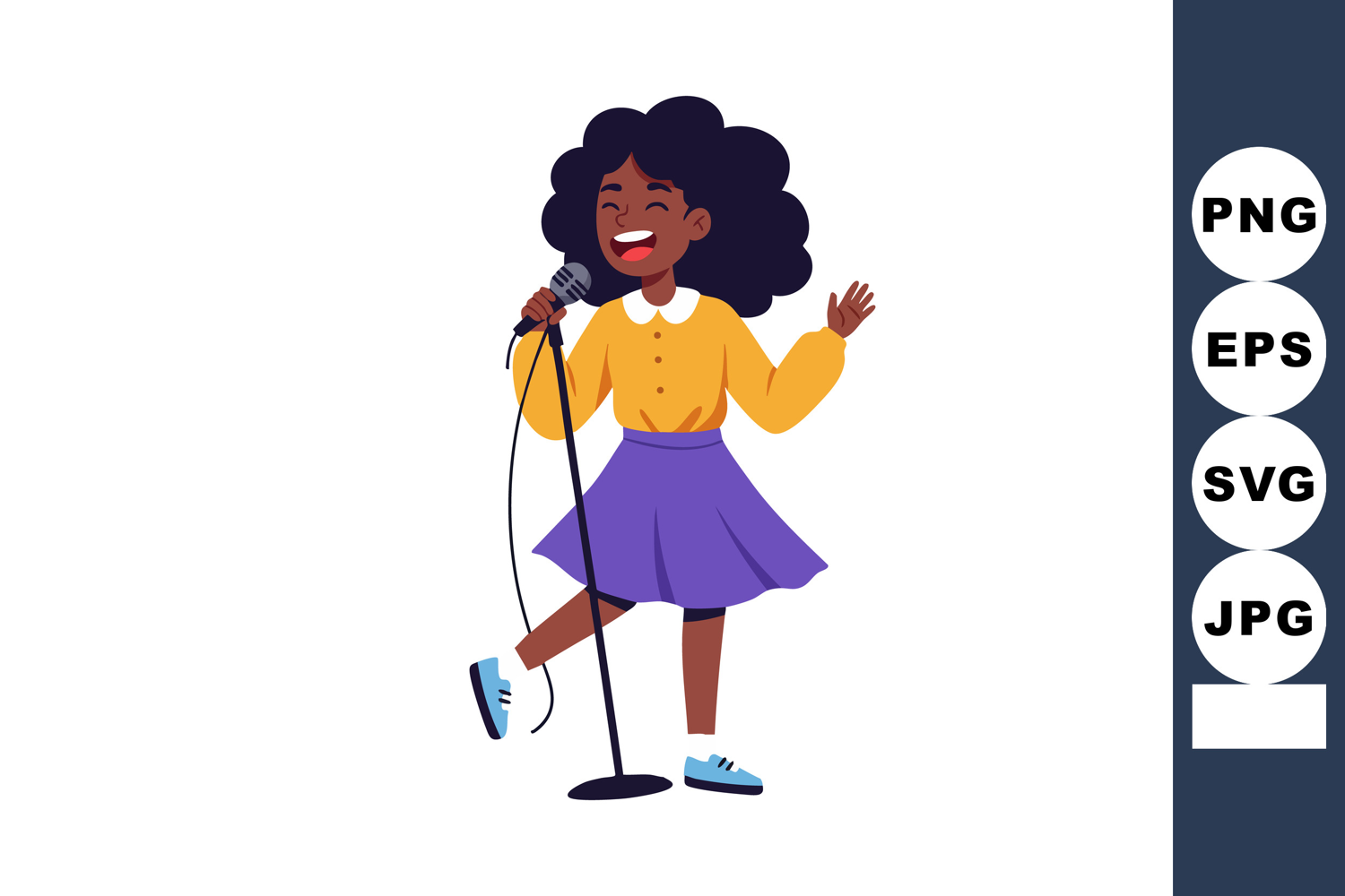 Vector illustration shows a young girl joyfully singing into a microphone with a stand, wearing a yellow top and purple skirt. Energetic and cheerful.