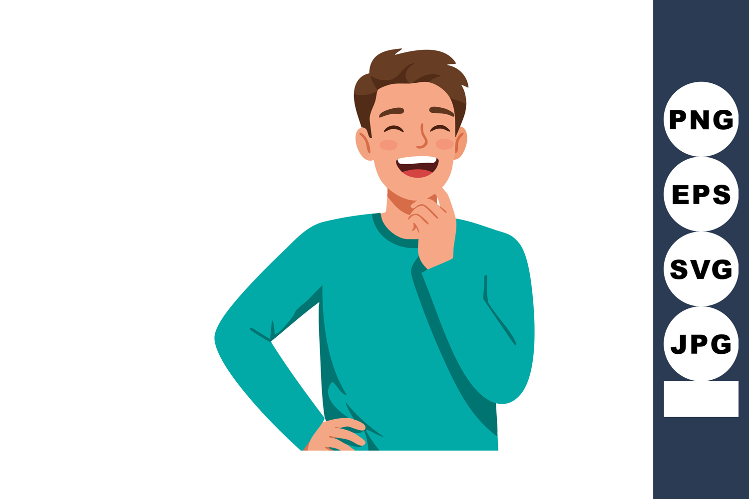 Young man laughing with hand on chin in teal shirt illustrat example image 1