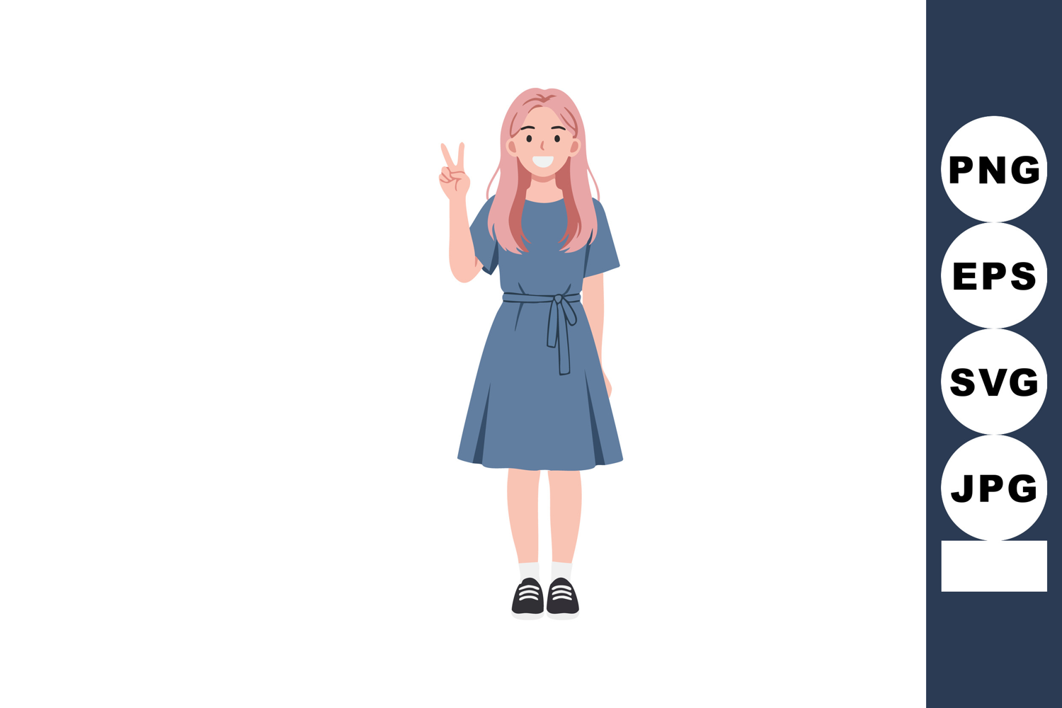 Illustration shows a young woman smiling and standing with a peace sign wearing a blue dress and black shoes, conveying a cheerful mood.
