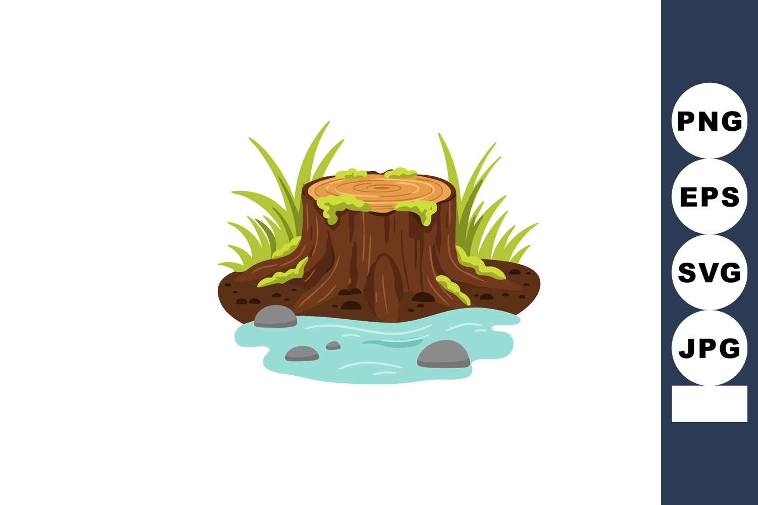 Illustration shows a tree stump covered with moss, surrounded by green grass and stones near a small water body, depicting a calm nature scene.
