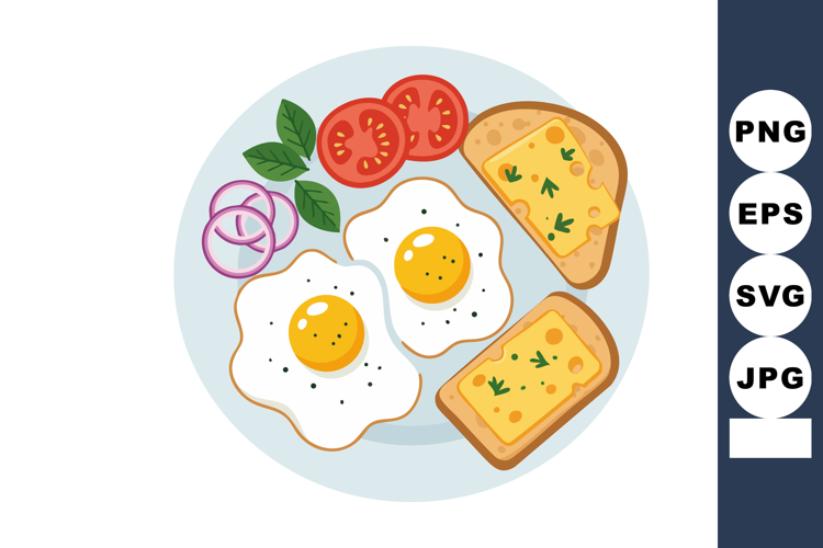 This vector illustration shows a breakfast plate with fried eggs, toast, tomato slices, and onion rings, presenting a fresh and colorful meal. Cheerful.