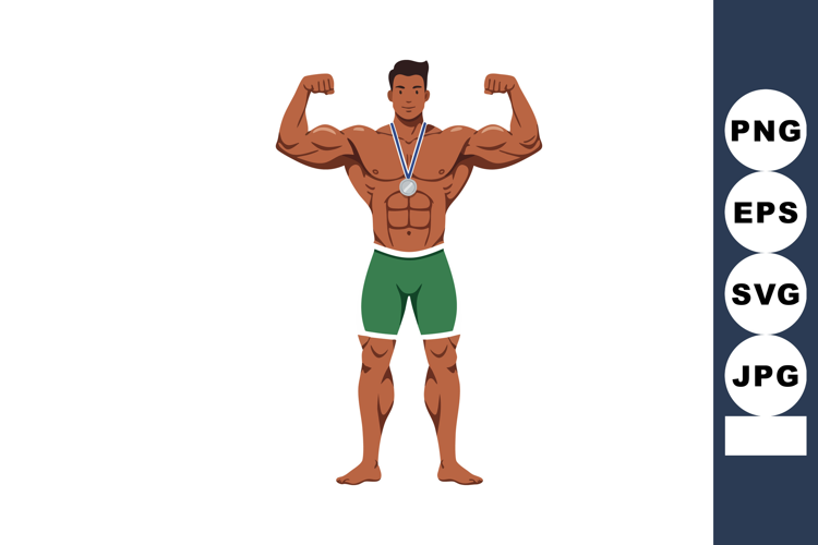 Muscular man flexes his muscles proudly wearing a silver medal and green shorts in a confident pose vector illustration energetic