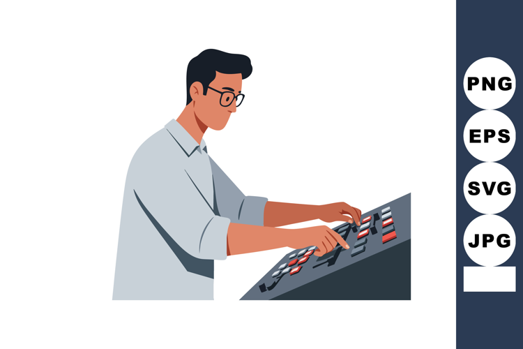 Illustration shows a man wearing glasses operating a control panel with buttons and switches, focused on task, calm mood.