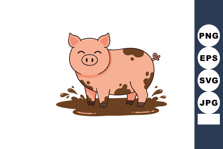 Illustration shows a smiling pig covered in mud standing in a puddle of brown dirt, creating a playful and cheerful mood.