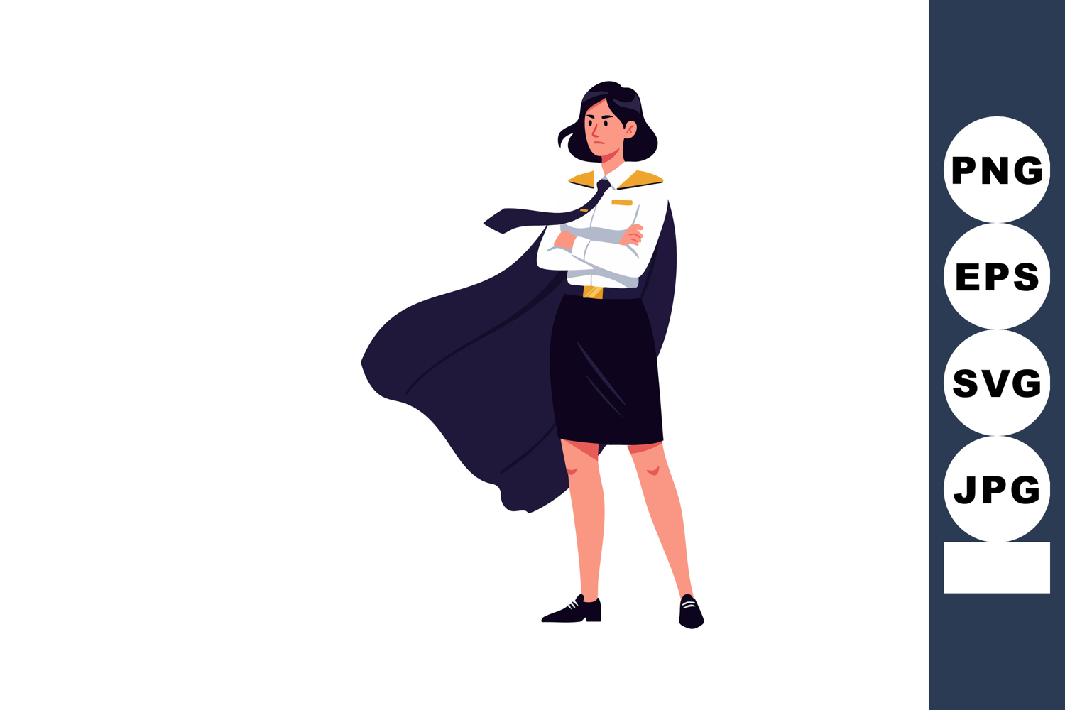 Illustration shows a confident businesswoman wearing a black cape and formal attire standing with crossed arms in a powerful pose. Empowering mood.