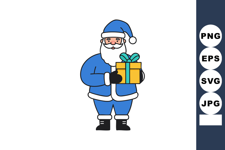 Santa Claus wears a blue suit and holds a yellow gift box with a green ribbon, representing Christmas holiday spirit. Cheerful mood.