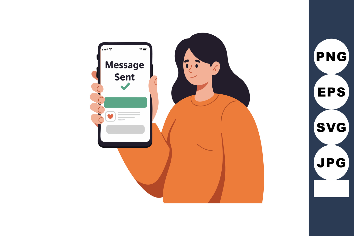 Illustration of a woman showing a smartphone screen with a message sent confirmation, conveying communication and success mood.