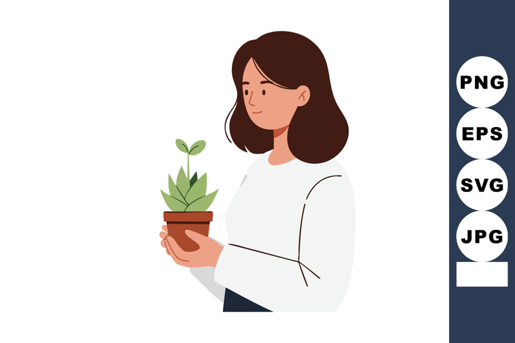 Woman holding potted green plant vector illustration with br example image 1