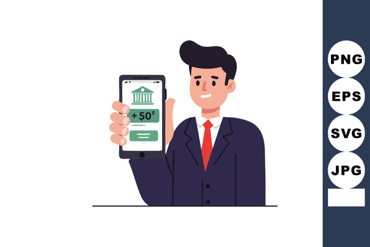 Businessman in suit holds smartphone displaying bank app with positive balance update, symbolizing financial success and confidence. Optimistic mood.