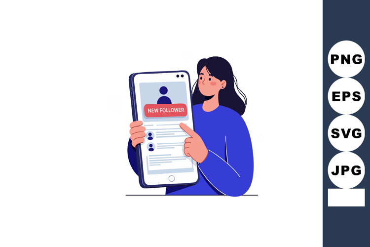 Illustration of a woman holding a smartphone displaying a new follower notification on social media, conveying connection and engagement feeling.