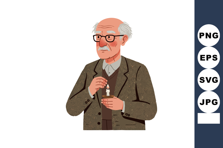 Illustration of an elderly man with white hair and glasses holding a lit candle, dressed in a brown suit, appearing thoughtful and calm. Serene mood.
