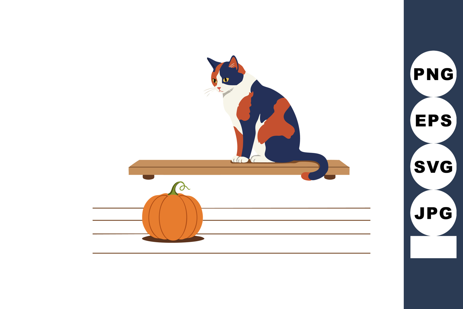 Calico cat sitting on wooden shelf above orange pumpkin vect example image 1