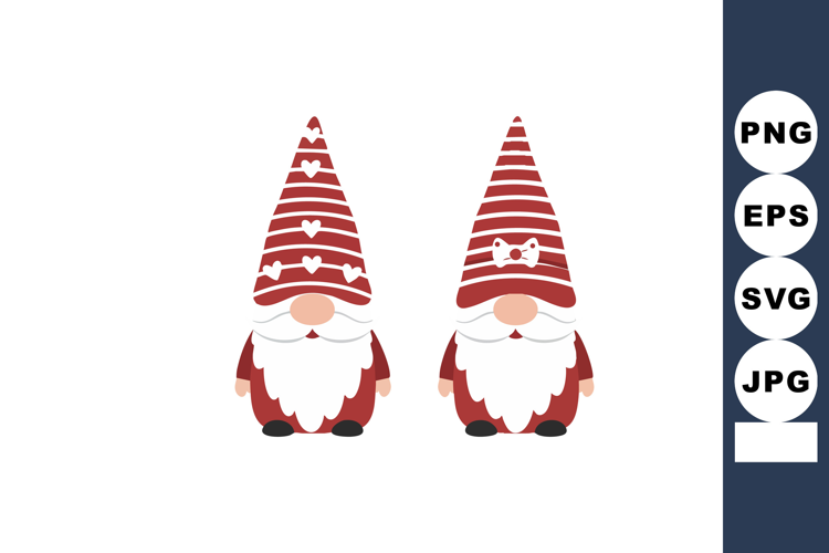 This vector shows two cute Christmas gnomes wearing red and white striped hats with hearts and frog motifs, creating a festive and joyful mood.