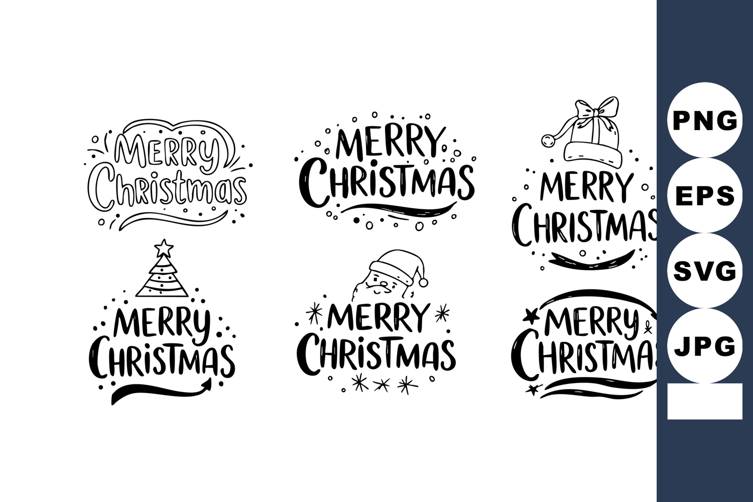 This vector features six Merry Christmas hand lettering designs decorated with festive icons and holiday-themed accents in black and white style. Cheerful.