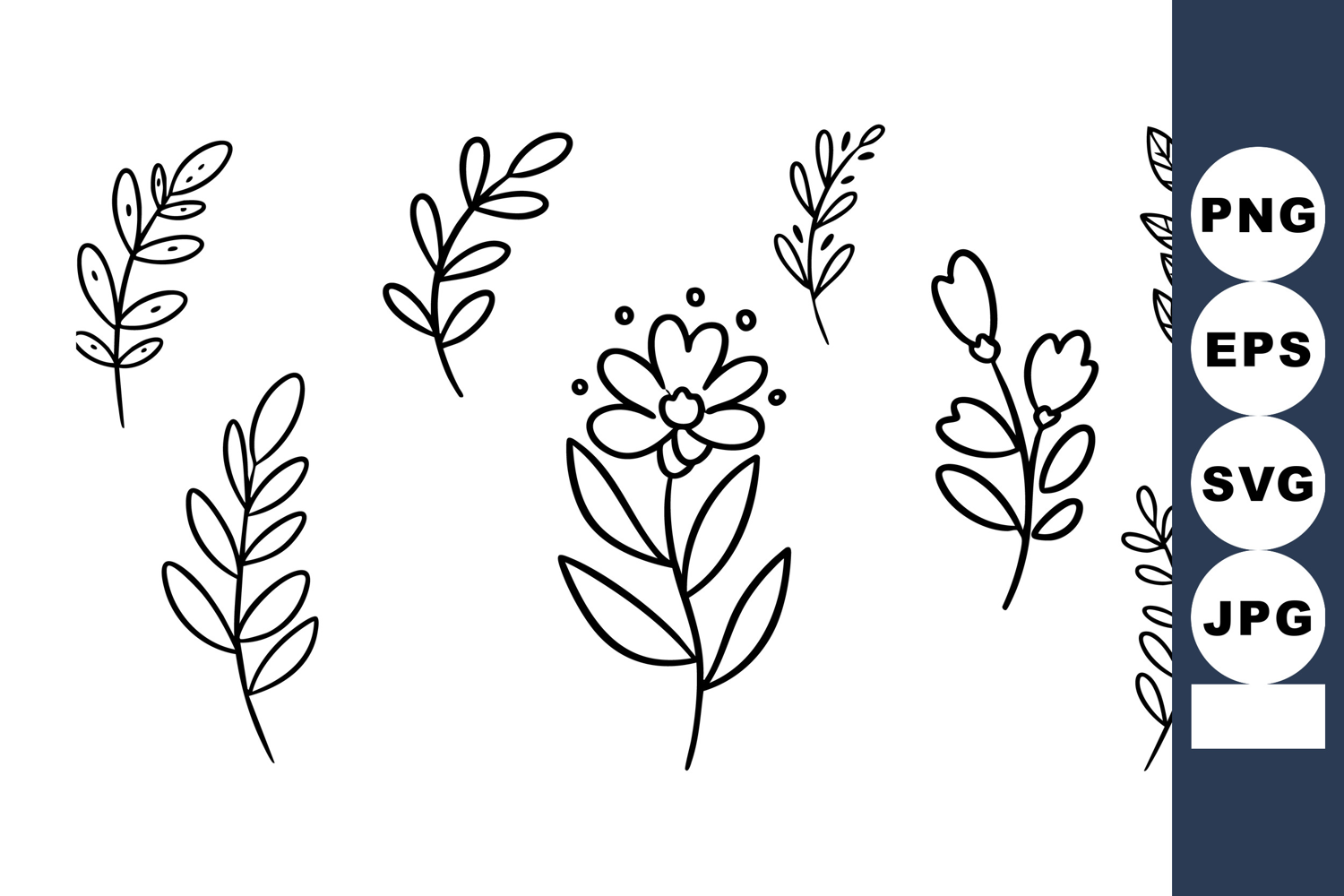 Vector features hand-drawn black line art floral branches and flowers with varying leaf shapes, creating a delicate natural mood.