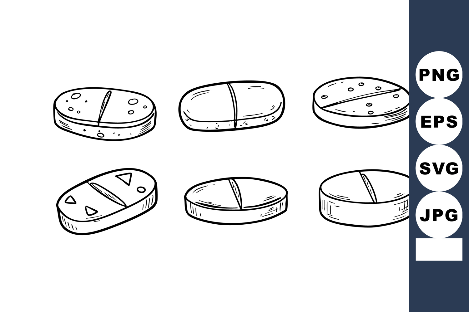 This vector illustration shows six hand drawn medicine pills and capsules in black and white style with detailed line work. Simple and clean design. Calm.