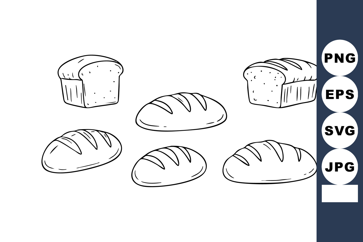 Illustration shows different bread types including loaves and sliced bread in simple line art style, conveying a basic food theme. Calm.