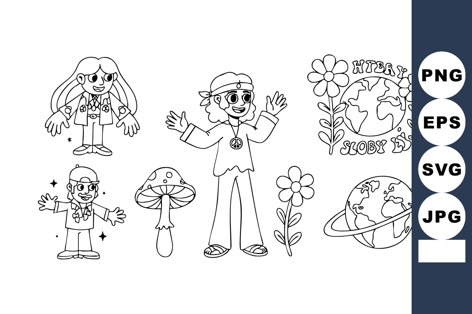 Vector illustration shows children, peace signs, flowers, earth, planet, and mushroom in black line art style, creating a playful and hopeful mood.