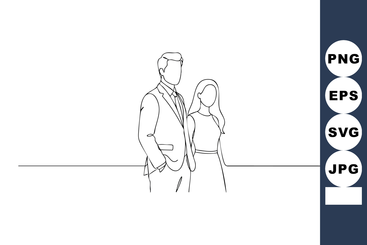 This vector features a minimalist continuous line drawing of a man and woman standing side by side, expressing simplicity and elegance mood.