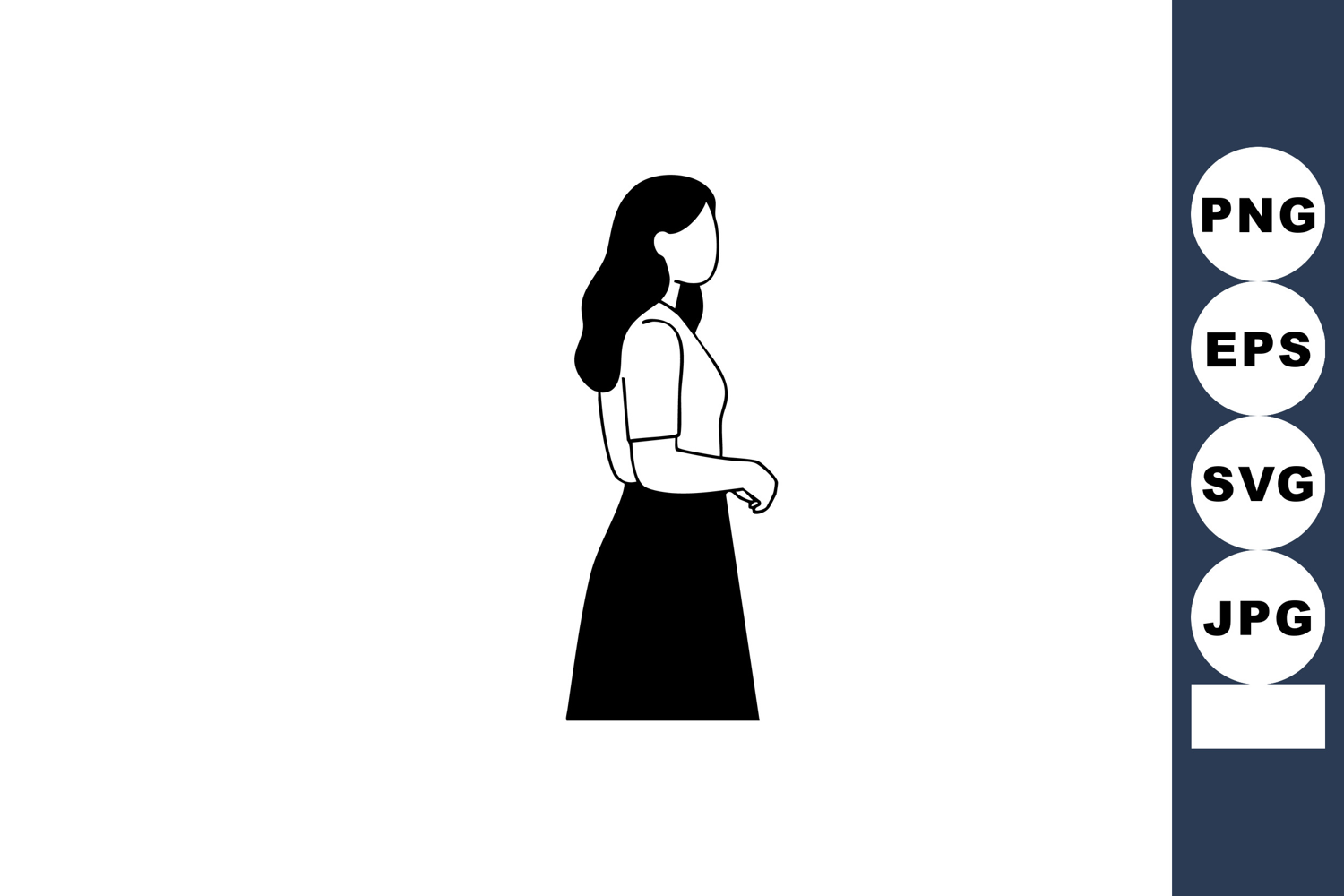 Vector illustration shows a woman standing in side view wearing a skirt and blouse with simple black and white style, calm mood.