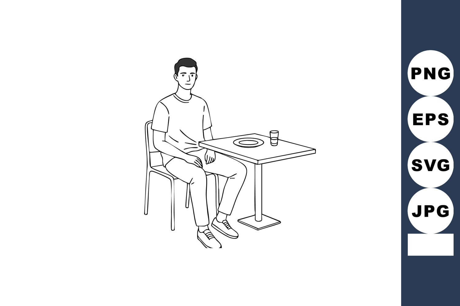 Illustration shows a young man seated at a table with a glass of water, rendered in minimalist black line art style. Calm and peaceful.