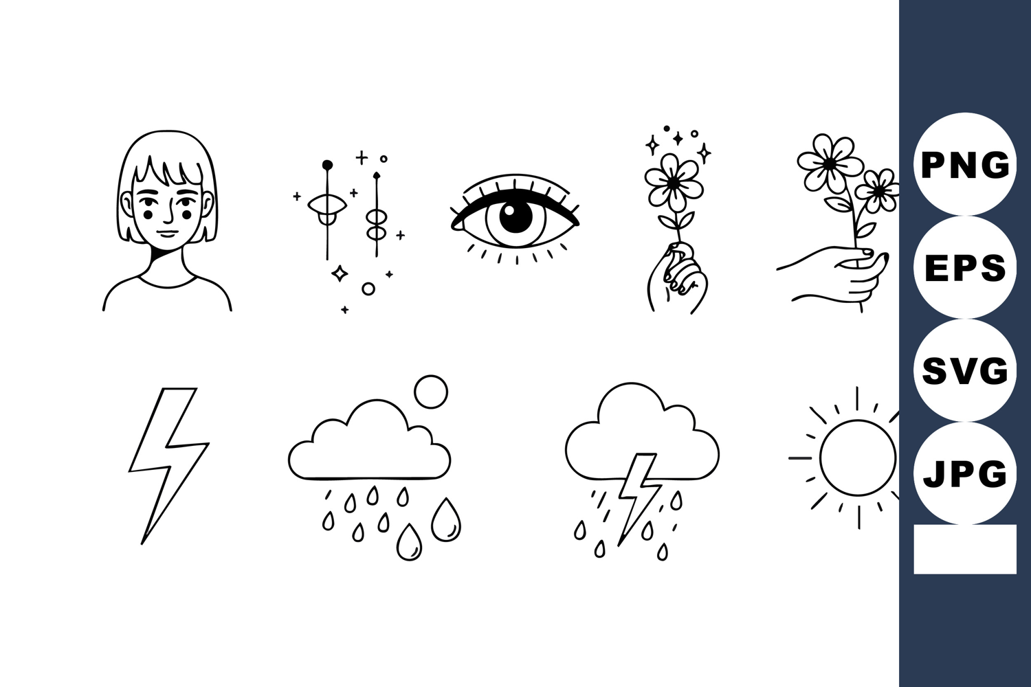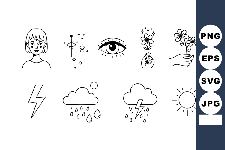 Woman eye flowers hands lightning rain sun simple line art v example image 1