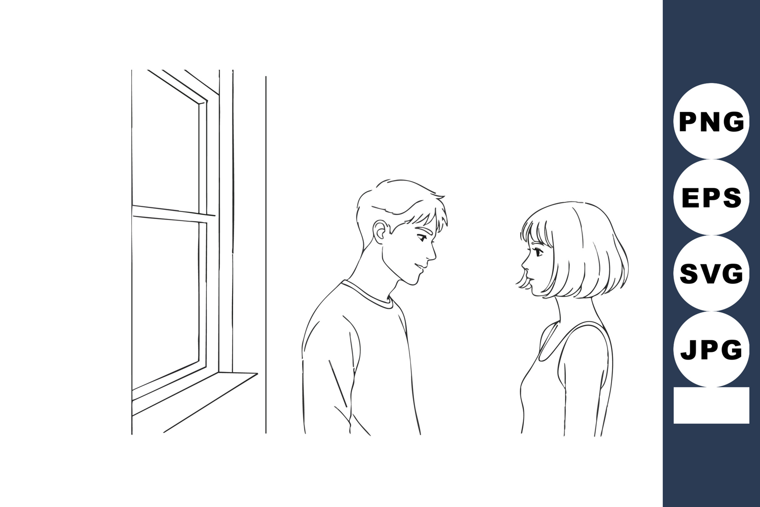 Illustration Vector Man Woman Young Line Art Face People Standing Window