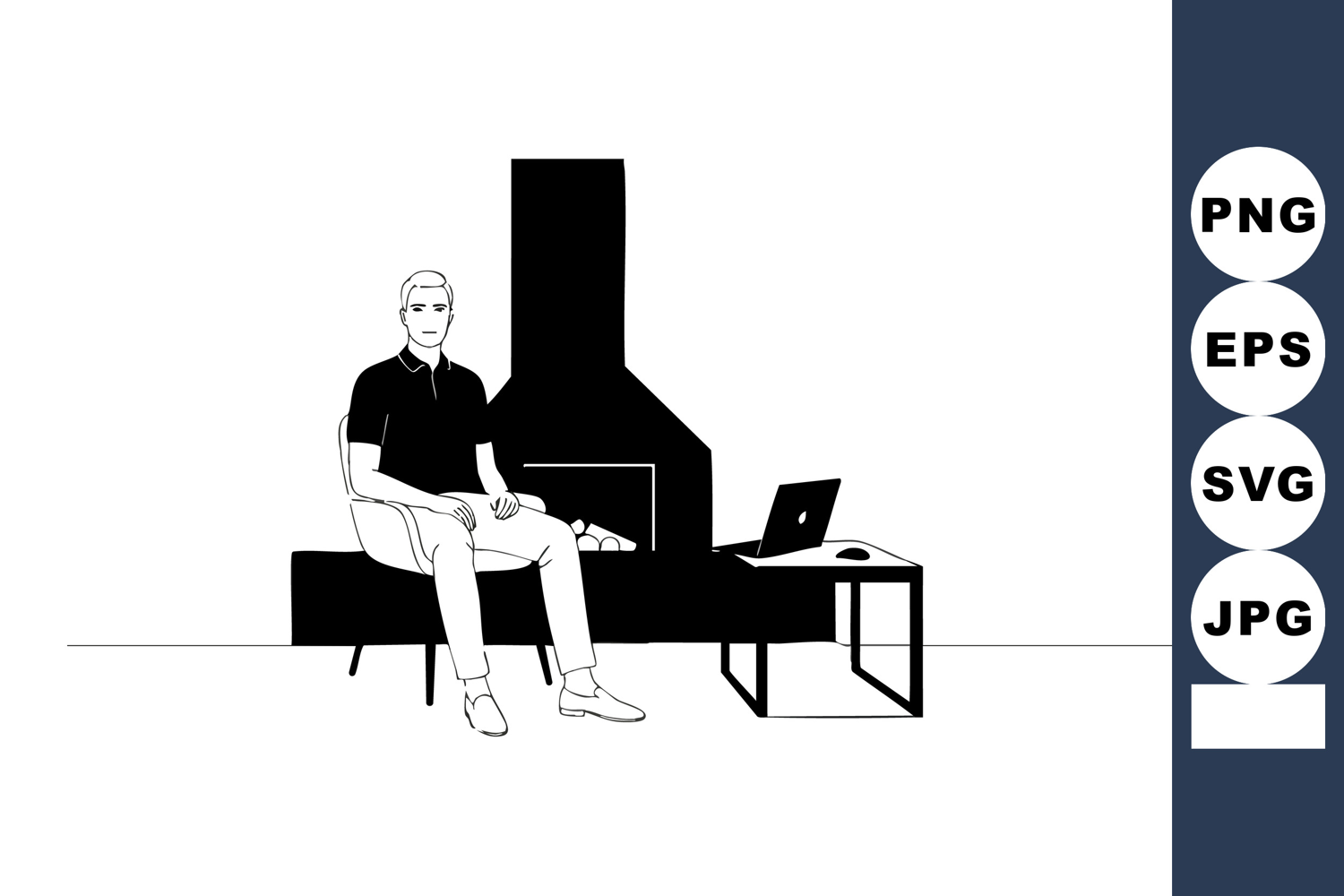 Man Sitting Near Fireplace Working on Laptop Indoor Minimali example image 1