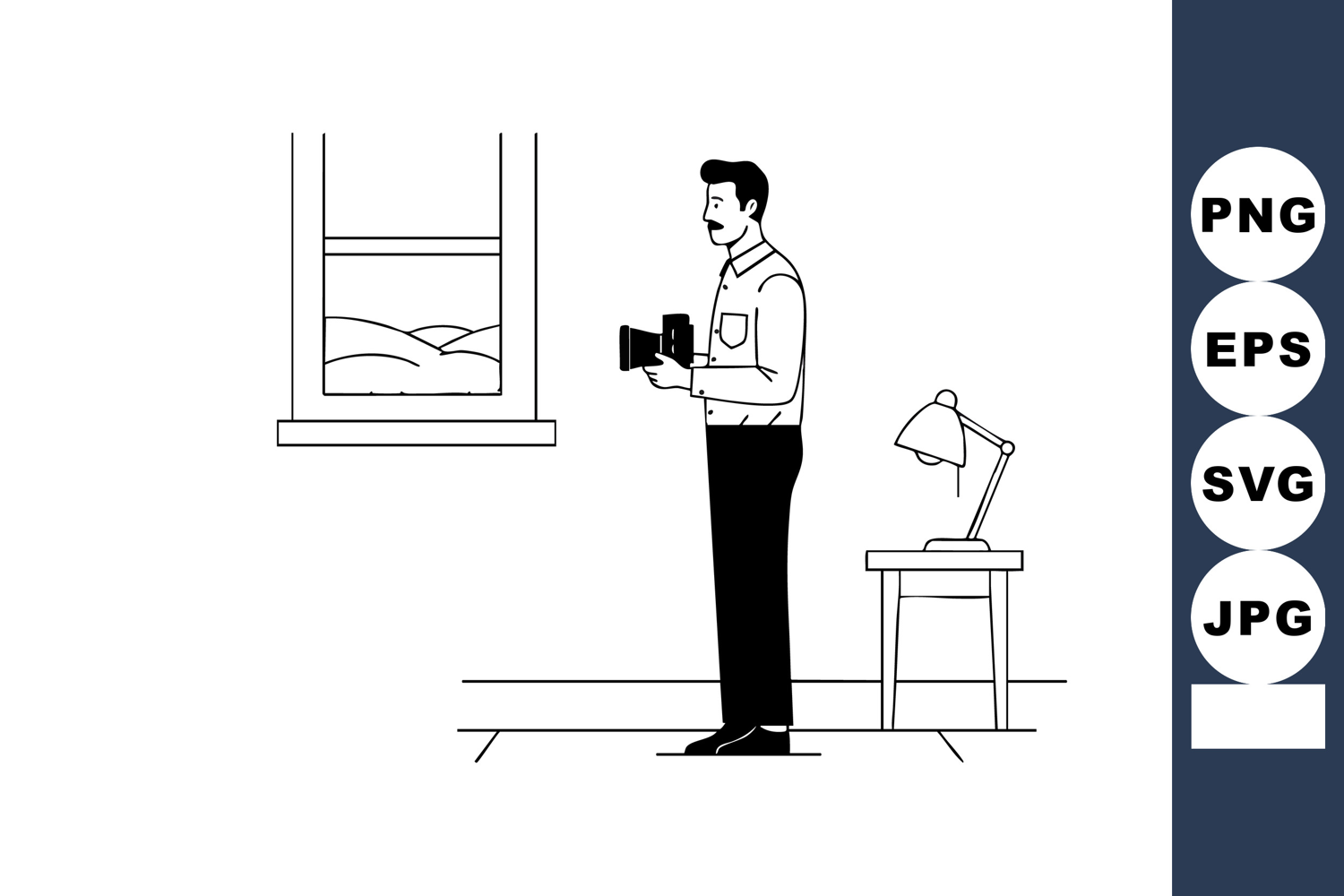 Illustration shows a man standing indoors holding a camera near a window and table lamp in minimalist style, creating calm mood.