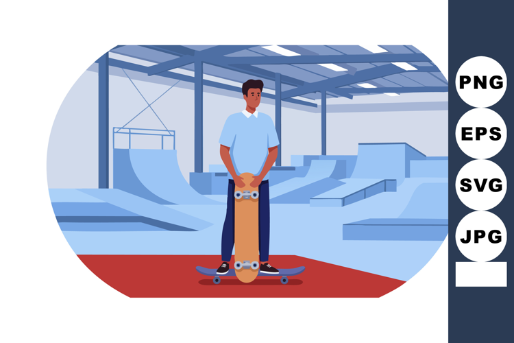 Illustration shows a young man standing with a skateboard in an indoor skate park featuring ramps and rails, creating an active atmosphere.