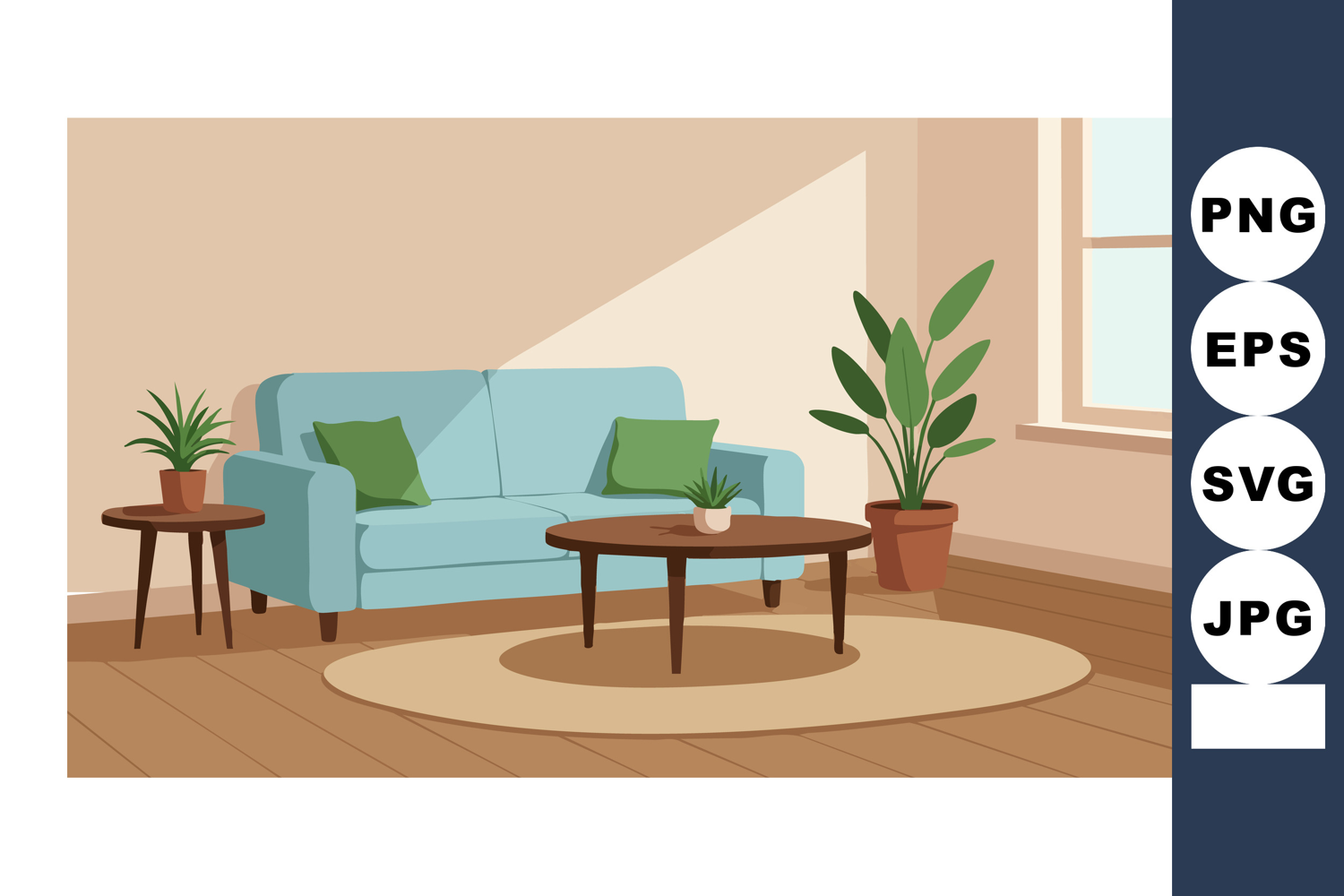 Vector illustration shows a modern living room with a blue sofa green cushions wooden tables and green indoor plants in natural light cozy mood.
