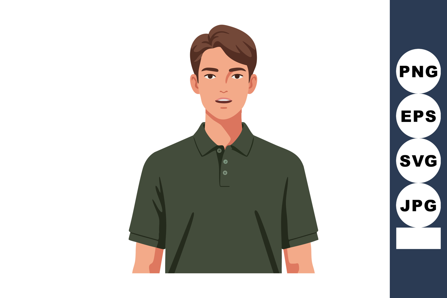Illustration shows a young man wearing a green polo shirt with short brown hair and neutral expression in portrait orientation. Calm mood.
