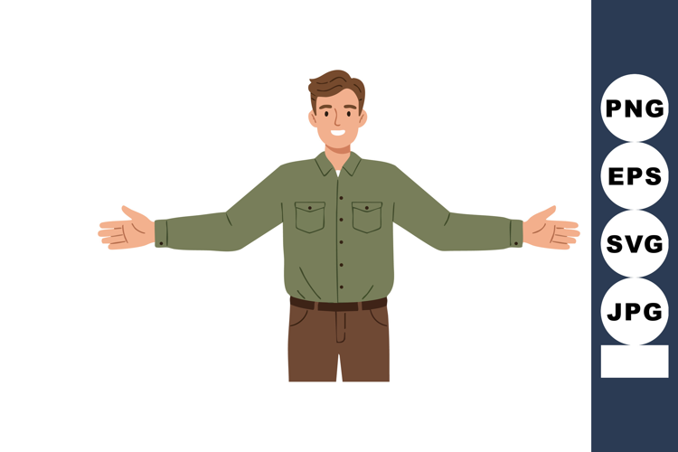 Illustration shows a man with open arms wearing casual clothes, expressing a welcoming and friendly mood.