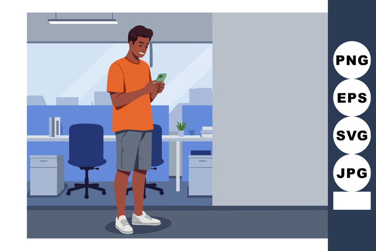 Illustration shows a young man standing in an office using a smartphone, surrounded by chairs and desks, conveying a calm atmosphere.