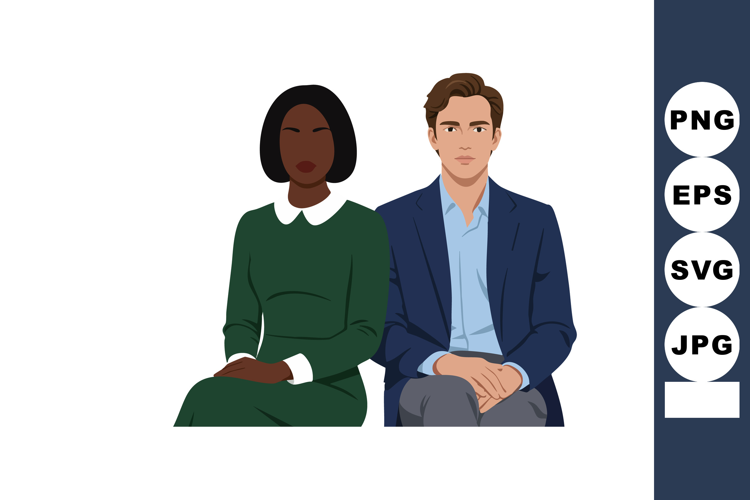Illustration shows a diverse business man and woman sitting side by side in formal clothing, presenting professionalism and unity. Calm mood.