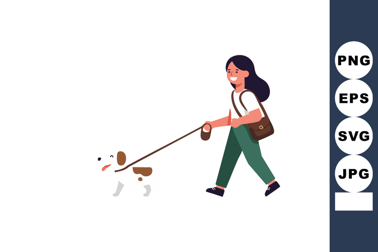 Illustration shows a woman walking a small dog on a leash outdoors with a joyful expression, conveying a lively mood.