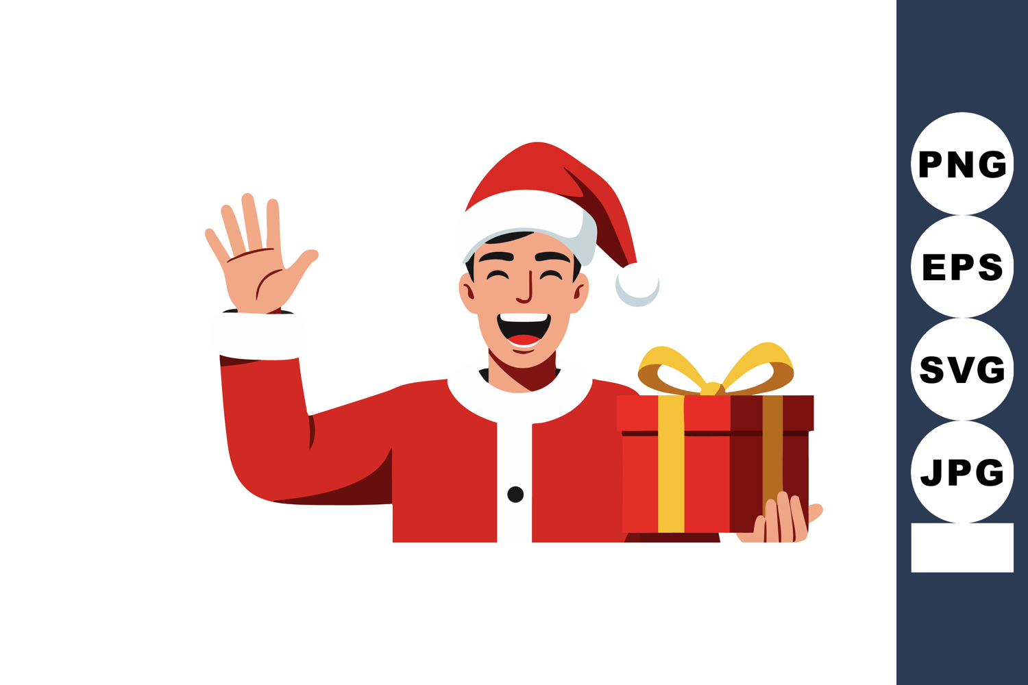Illustration shows a man dressed in a red Santa Claus outfit, holding a wrapped gift box and waving happily, creating a festive mood.