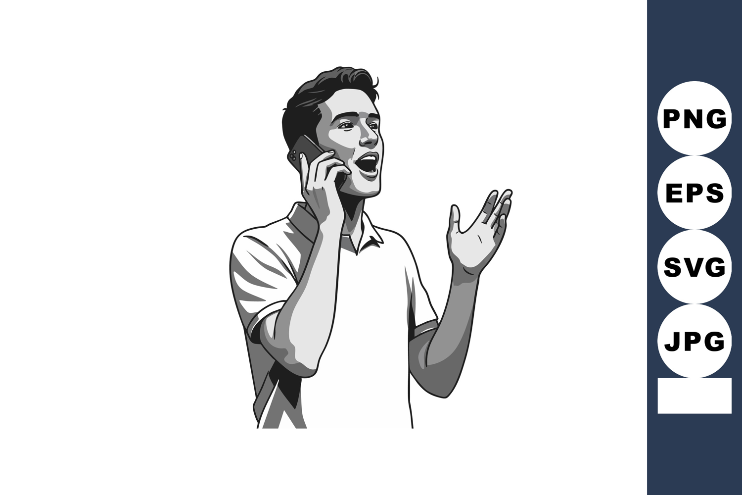 Illustration shows a young man speaking on phone with expressive hand gesture in black and white vector style, conveying lively communication mood.