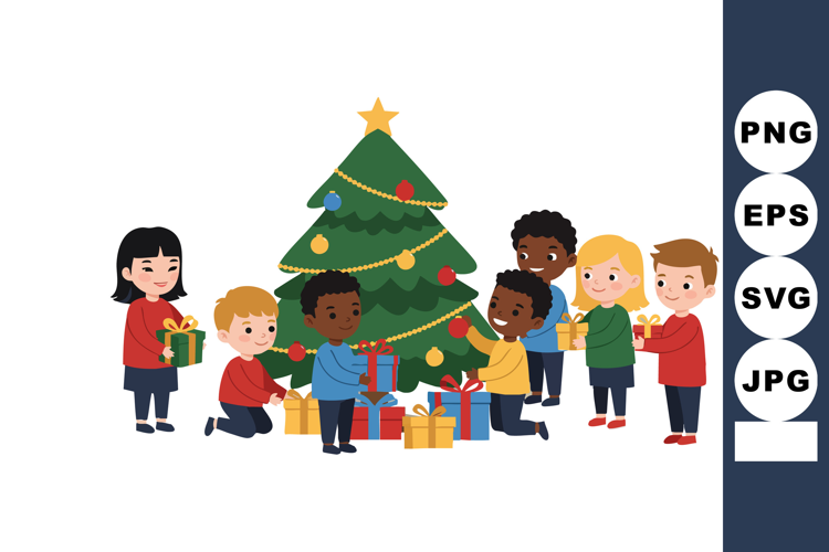 Illustration shows diverse children happily placing gifts around a decorated Christmas tree in a festive holiday celebration mood.