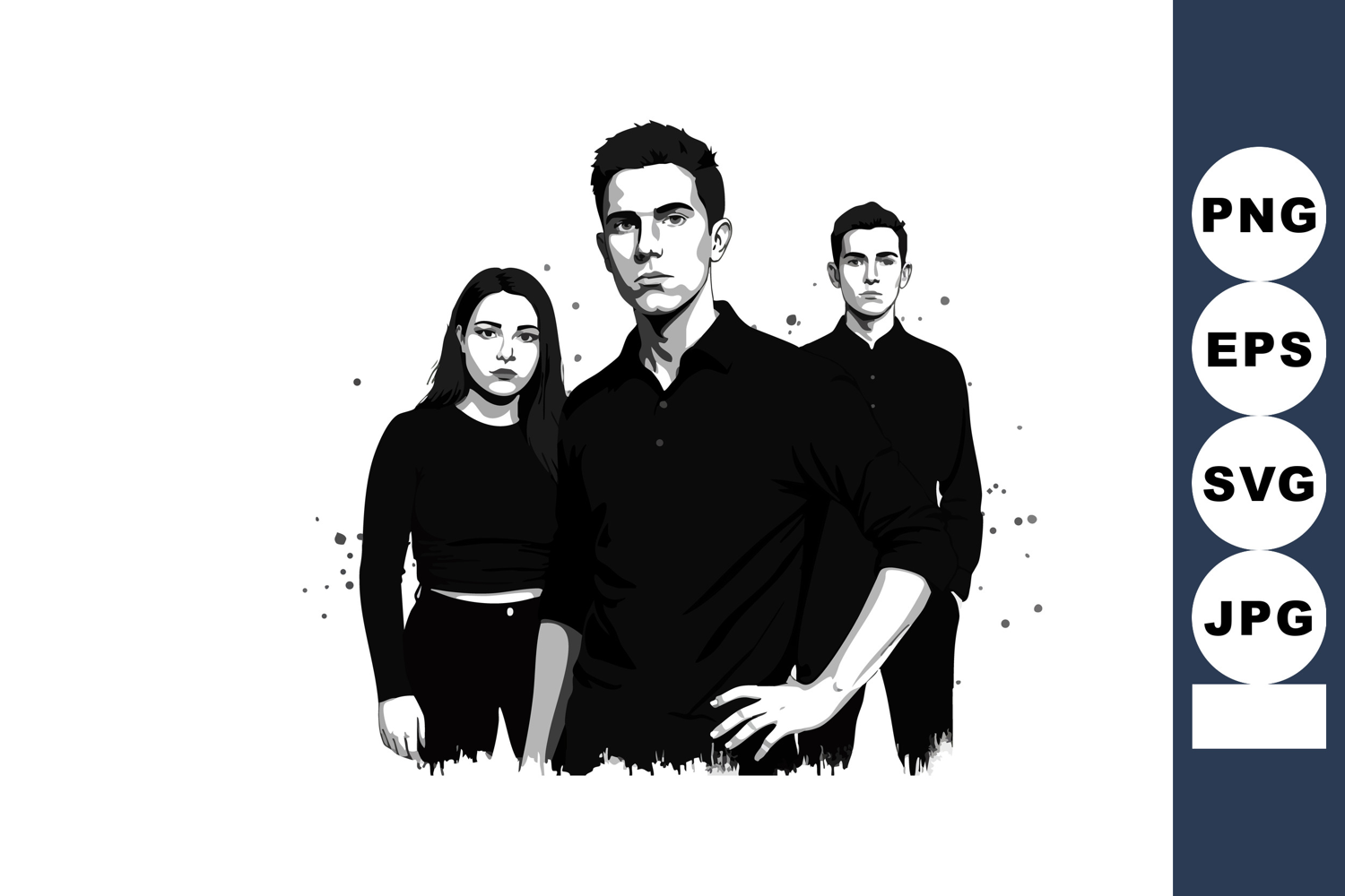 Three young adults dressed in black stand confidently facing forward with a monochrome style and serious expressions, evoking a bold and intense mood.