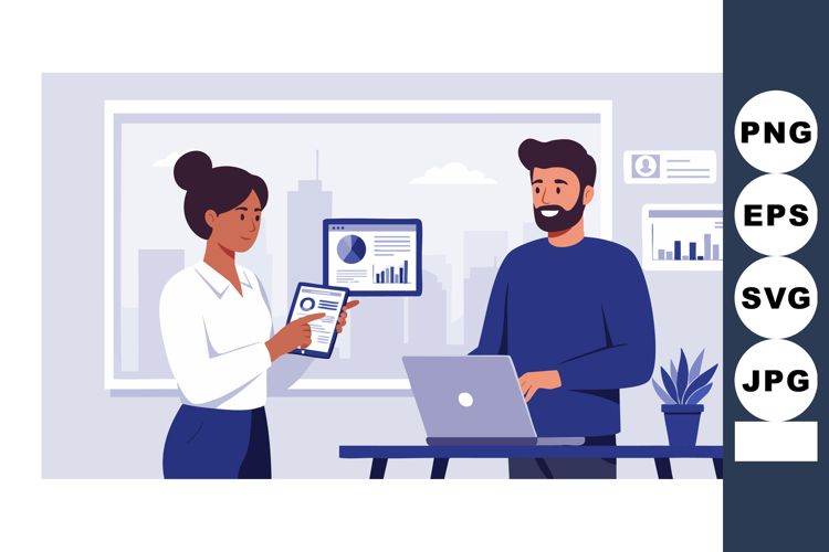 Two business colleagues work together using charts and a laptop in a modern office setting, fostering teamwork and productivity. Professional mood.