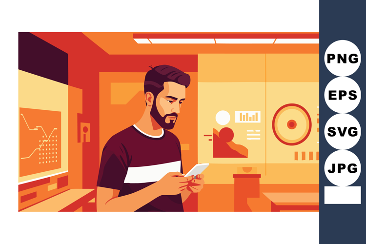 Illustration shows man focused on smartphone in modern office with orange lighting and digital displays, conveying concentration and technology mood.