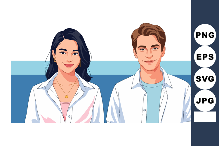 Illustration shows young man and woman smiling, dressed in casual white tops with blue background, presenting friendly and relaxed mood.