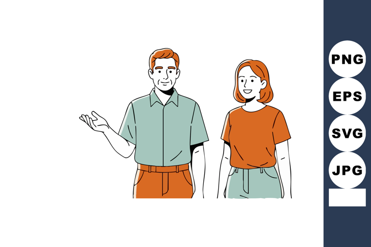 Illustration shows a man and woman standing side by side, wearing casual outfits with natural poses and expressions, conveying calm and friendliness.