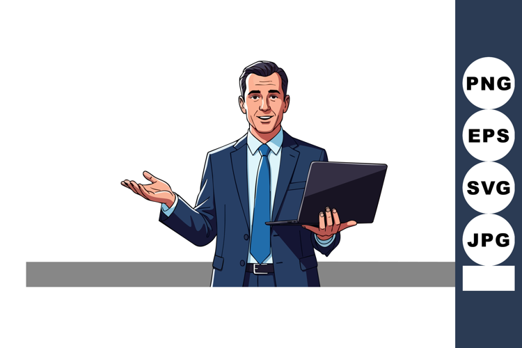 Vector illustration of a businessman in a suit holding a laptop and gesturing with his hand, presenting confidently, in a professional setting. Calm mood.