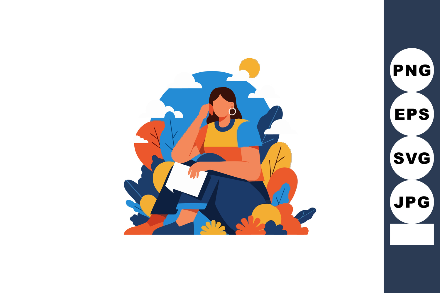 Illustration of a woman sitting outdoors with a notebook and phone, surrounded by colorful autumn leaves in a relaxed mood.
