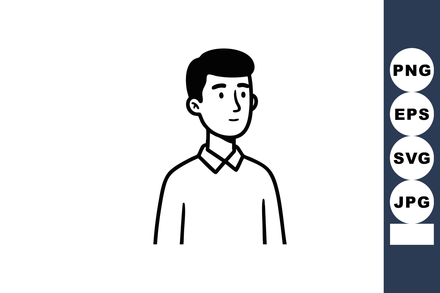 This vector illustration shows a young man with short hair in black and white line art style, creating a clean and minimalistic mood.