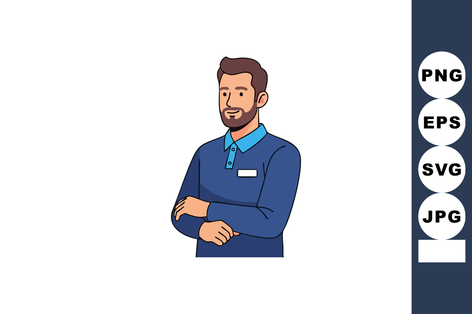 Illustration shows confident businessman wearing blue shirt and tie with folded arms in portrait orientation. The mood is professional and calm.